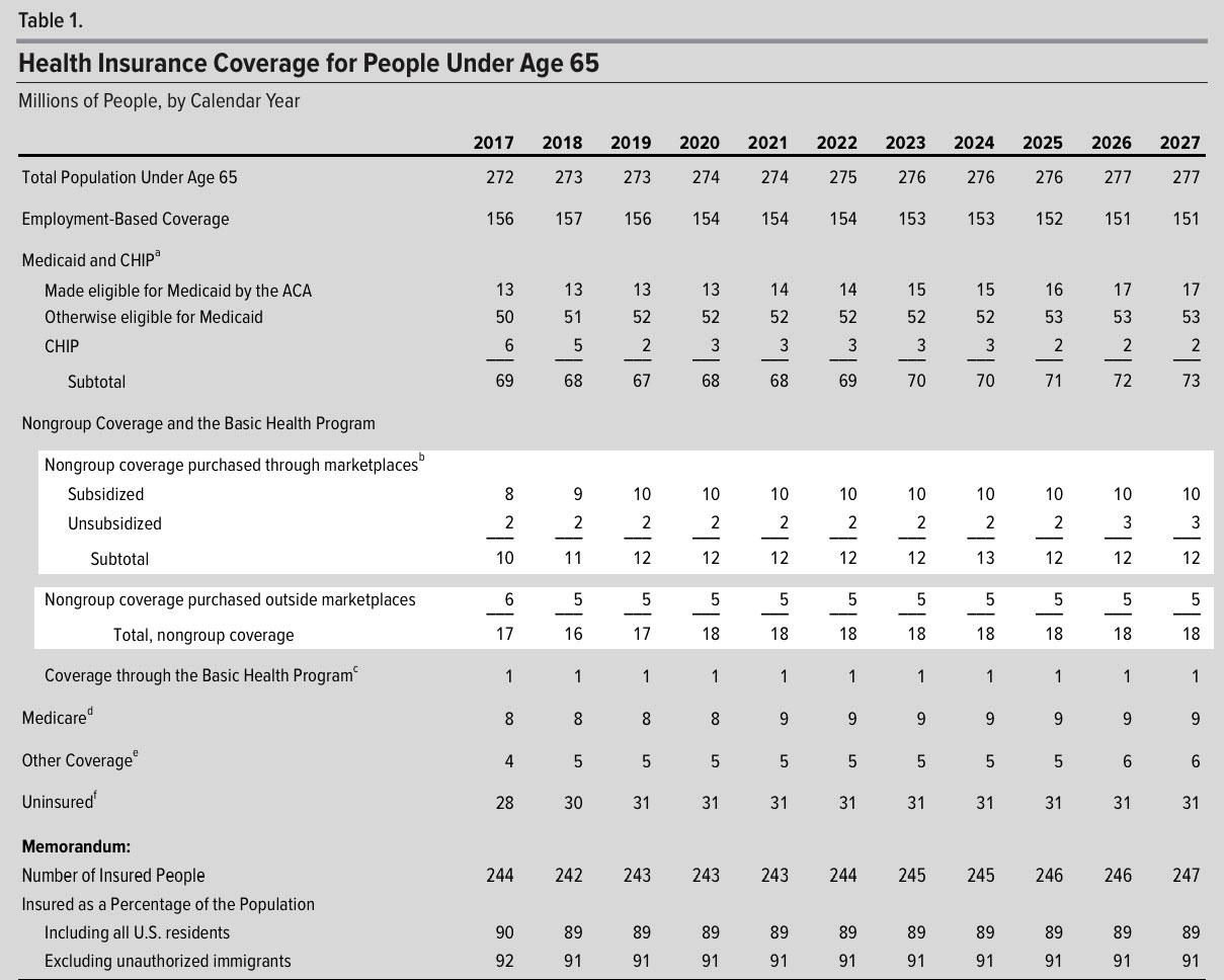 OK, so under current law (that is, the ACA as it stands today, the CBO now projects that the total individual market pretty much hangs around the 17-18 million level for the next decade, neither growing nor shrinking by much. Fair enough.