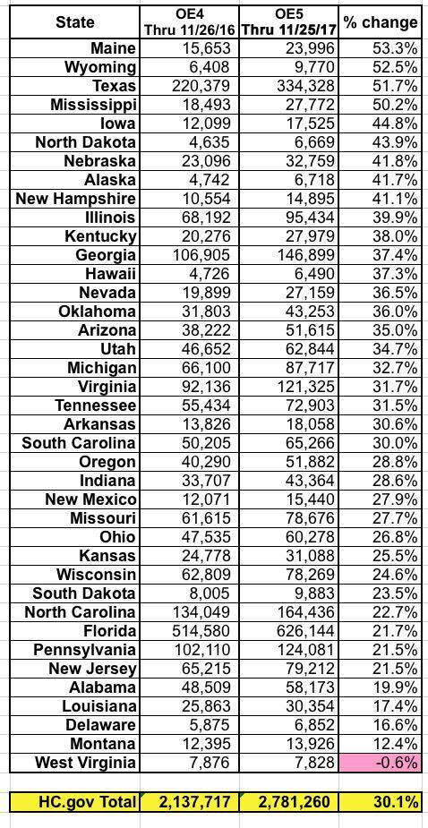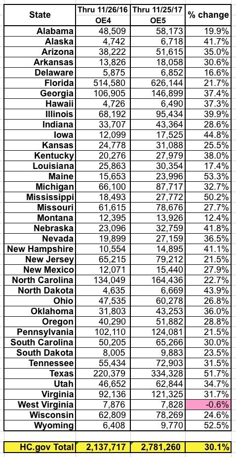 Overall, enrollments are up 30% year over year so far...although again, you'd have to tack on a small number of enrollments for 11/26 to get an exact match (it wasn't just a Sunday, but Sunday on a holiday weekend, so it was likely a pretty nominal number...probably no more than 25,000 or so at most, I'd imagine, bringing the grand total up to around 2.8 million even, or around 31% higher). This is down from around 38% higher last week, which was down from being 47% higher through week 2 and 45% higher in week 1. This, again, is pretty much in line with my expectations: There was no way that enrollment was gonna continue to run nearly 50% ahead of last year, even given the shortened timeframe.