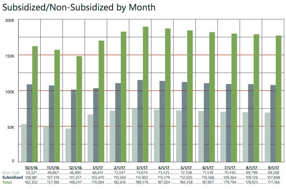 - As of September, 61% of effectuated enrollees were subsidized (this is down slightly from 62% subsidized as of the end of Open Enrollment, which suggests that subsidized and unsubsidized enrollees are just as likely to drop out mid-year for whatever reasons. This surprises me, to be honest (and probably won't hold true for 2018...although unsubsidized enrollees are far more likely NOT to enroll in the first place for 2018 anyway...)