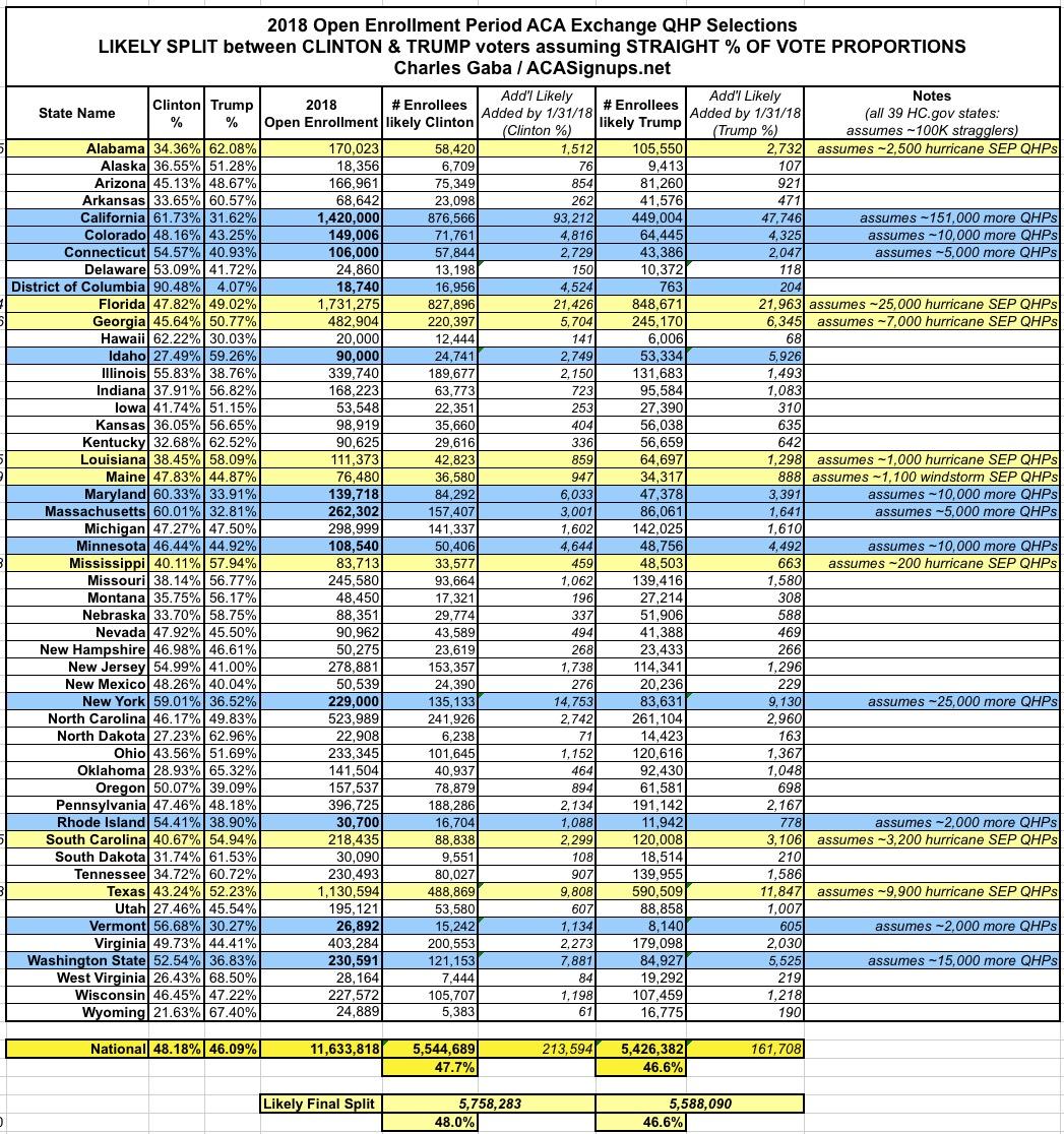 Of course, there's also some missing enrollees on the HC.gov side, due to the hurricane SEP (7 out of 8 states of which went to Trump), along with those who enrolled between Midnight and 3am Eastern Time on 12/16, and some who had to leave their phone number for a callback. I'm estimating those at perhaps 150,000, of which I concede the vast majority would come from Trump states; let's call it ~130K out of ~150K.