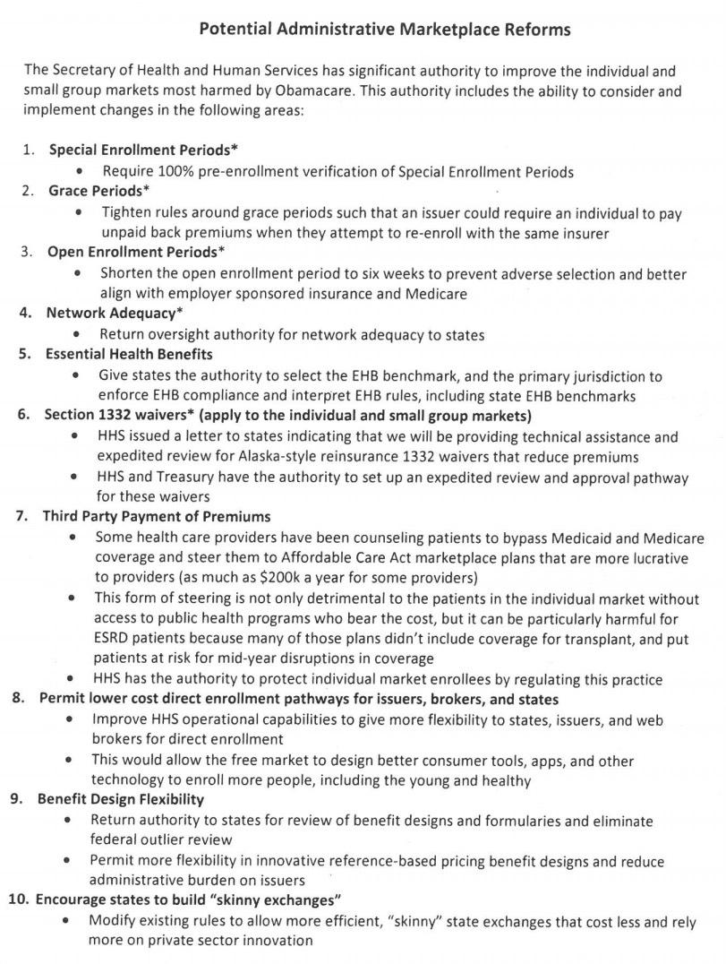 ...The document lists 10 executive actions the Trump administration planned to take to “improve the individual and small group markets most harmed by Obamacare.”