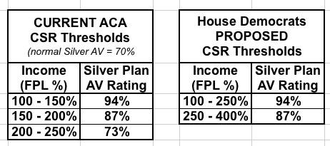 The legislation would expand eligibility for cost sharing reductions (CSRs) beyond 250 percent of the FPL, up to 400 percent, and would make CSRs more generous for those below 250 percent of the FPL.