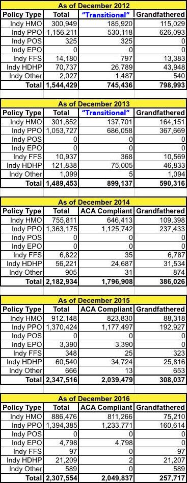 As a reminder: The ACA was signed into law in March 2010. Under ACA provisions, anyone who remained continuously enrolled in a non-ACA compliant individual market policy from before then was allowed to stay enrolled in it for as long as they wanted to...assuming the insurance carrier chose to keep offering it. Any individual market policy which wasn't ACA compliant which people enrolled in after March 2010 was supposed to be terminated as of December 31, 2013, with only ACA-compliant policies being valid starting on January 1, 2014.