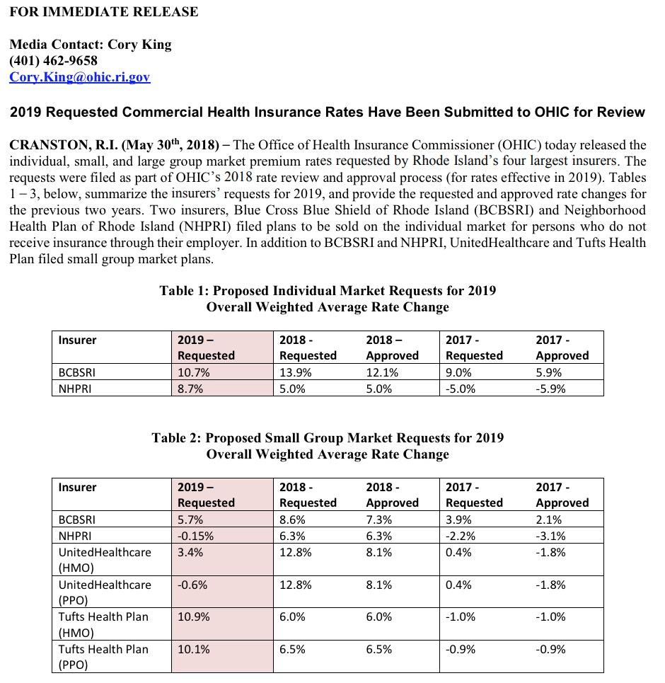 Rhode Island: Preliminary 2019 ACA rate hike request: 9.3%, 1 point due to mandate repeal (updated)
