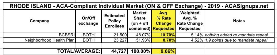 - First, the actual current enrollment in ACA-compliant individual market policies in Rhode Island as of March 31st (including off-exchange enrollees) was actually 21,500 for BCBSRI and 23,227 for Neighborhood Health Care, which means it's actually close to a 50/50 split between the two (Neighborhood holds the bulk of exchange enrollees but BCBS has most of the off-exchange market). I've updated the table below to reflect this; it bumps the statewide average requested increase slightly to 9.7% overall.