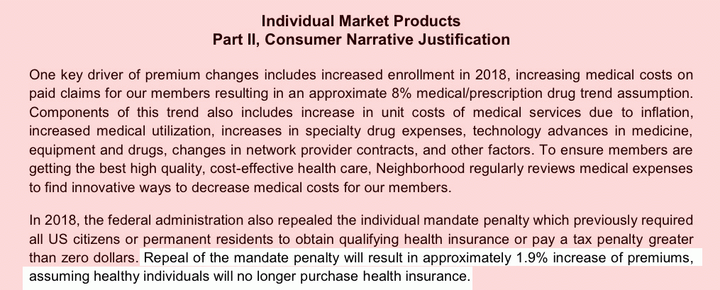 Unfortunately I haven't found the actual rate filing forms for BCBS, so I don't have an official estimate of what portion of their 2019 rate increase is being pinned on the ACA's mandate being repealed or the expansion of short-term or association plans by the Trump Administration, but Neighborhood's filing does give a hard number...and it's actually fairly small: Just 1.9 percentage points (that's for mandate repeal...they don't mention #ShortAssPlans at all).