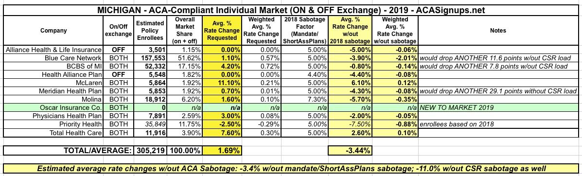 Michigan: Preliminary 2019 ACA rate hike request: Only 1.7%...but WITHOUT sabotage it'd DROP by 3.4% or more!