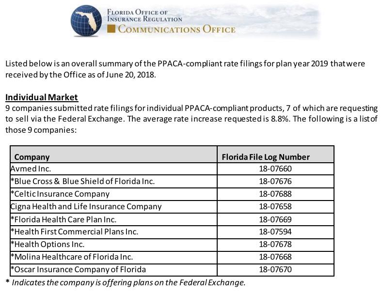 With that in mind, the Florida Dept. of Insurance has released a document with the top-line numbers for the 2019 ACA individual and small group markets. It's pretty skimpy on the details, providing only the carriers participating (9 on the individual market, 14 on the small group market), the fact that 7 of the 9 individual market carriers will be both on & off-exchange (the other two will be off-exchange only), and the average 2019 rate increases being requested: 8.8% for the individual market, 7.0% for the small group market.