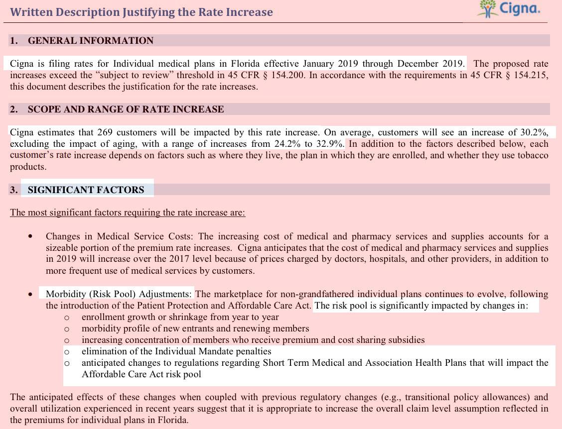 UPDATE: The folks over at Protect Our Care have managed to get ahold of one of the 2019 Rate Filings, for Cigna Health & Life Co. Cigna is asking for a whopping 30.2% average unsubsidized rate increase next year, ranging from 24 - 33%. Granted, Cigna also only has 269 enrollees, which explains why the weighted statewide average is "only" 8.8%, but otherwise their filing is pretty clear about what's to blame for a large chunk of it: