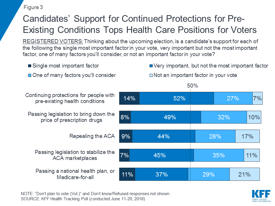 • Few voters (about one in ten) say a candidate’s support for a variety of different health care positions will be the “single most important factor” in their 2018 vote choice. But among the health care issues provided, majorities of Democratic voters, independent voters, and Republican voters say a candidate’s support for continued protections for people with pre-existing health conditions is either the “single most important factor” or “very important, but not the most important factor” to their vote.