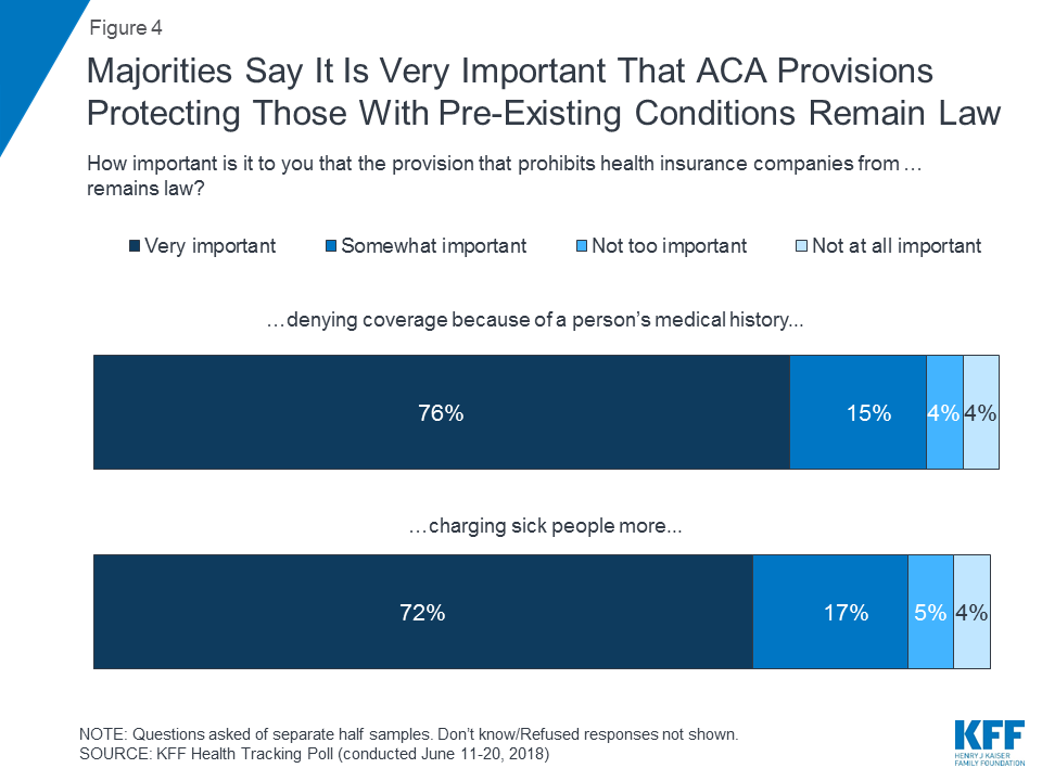 • In light of a recent federal lawsuit and subsequent decision by the Trump administration, this month’s tracking poll finds most of the public – including majorities of Republicans, Democrats, and independents – say it is “very important” to them that the ACA’s provisions protecting those with pre-existing conditions remain law. Three-fourths say it is “very important” that the ACA provision prohibiting insurance companies from denying coverage due to someone’s medical history remains law, and seven in ten say the same about the ACA provision prohibiting insurance companies from charging sick people more. Nearly six in ten Americans say they live in a household where someone has a pre-existing medical condition.