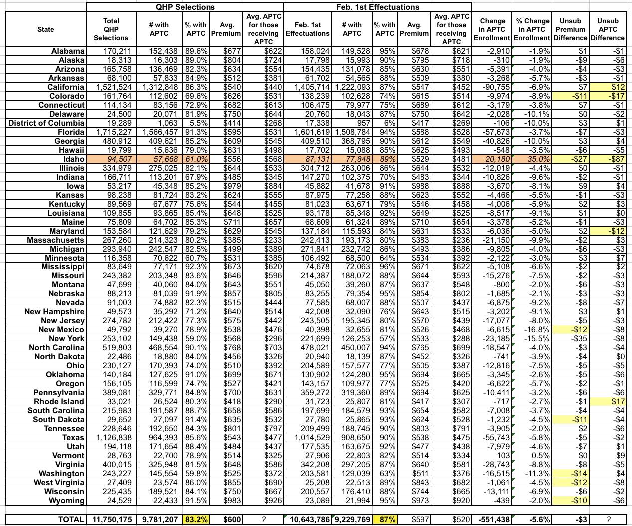 If you subtract them from the February-start total, you get a 91.1% payment rate for those who started coverage in either January or February. In other words, I was right all along. Note that this rate varies widely, from as low as 81% in New Mexico to as high as 97% in Alaska. Why? I'm sure there are various reasons depending on the specific demographics, plan offerings, networks and so forth in each state.