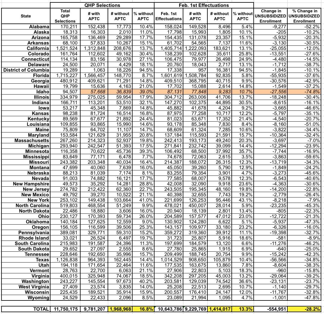 Here's the same comparison of unsubsidized exchange enrollment. I've removed the premium/subsidy columns (since subsidies aren't relevant here). As you can see, while Idaho remains a big question mark due to that likely erroneous "57.7K subsidized" cell, otherwise the picture is pretty eyebrow-raising: The unsubsidized enrollment total dropped more (555K, or 28.2%) than the subsidized total (551K, or 5.6%) did even though unsubsidized enrollees only make up about 1/6th of all exchange enrollees!