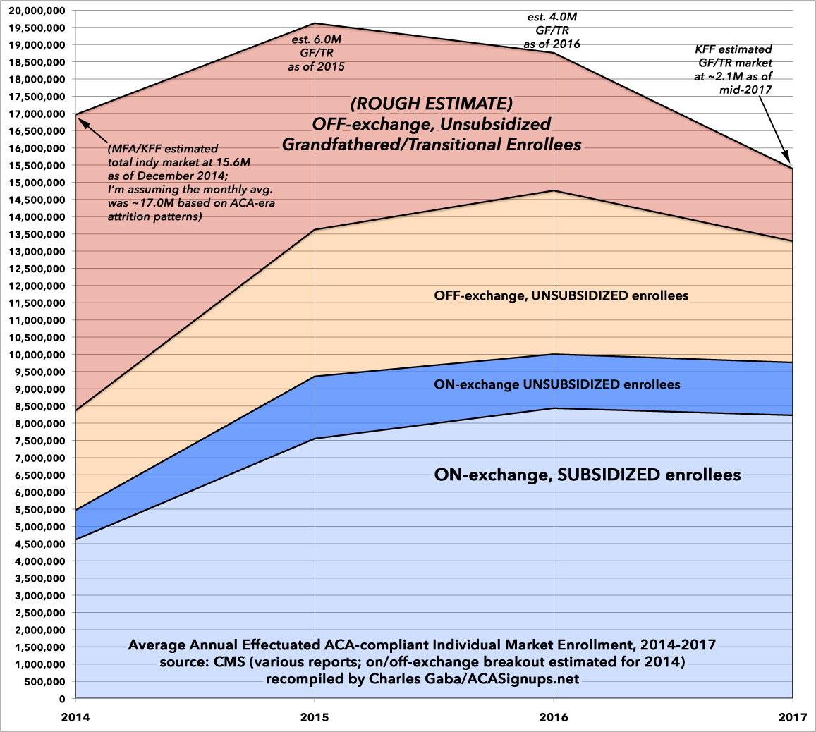 The biggest unknown is the Grandfathered/Transitional section at the top. For 2014, I started with this post by the Kaiser Family Foundation (using Mark Farrah Associates data), which pegged the total individual market at around 15.6 million people as of December 2014. I then used ACA-era attrition trends to assume that the monthly average enrollment in 2014 was likely around 17.0 million (that is, the December enrollment total should be roughly 92% of the monthly average). That means roughly 8.6 million Grandfathered/Transitional enrollees on average in 2014. For 2017, I used Kaiser's rough estimate of around 2.1 million. For 2015 & 2016 I just eyeballed it, figuring GF/TR enrollments were likely around 6.0M in 2015 and 4.0M in 2016.
