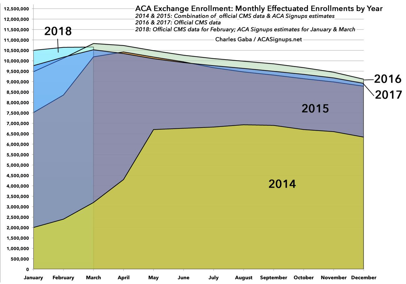 Here's what the monthly effectuations look like over the full 12-month period for every Open Enrollment Period so far, including the first quarter of 2018: