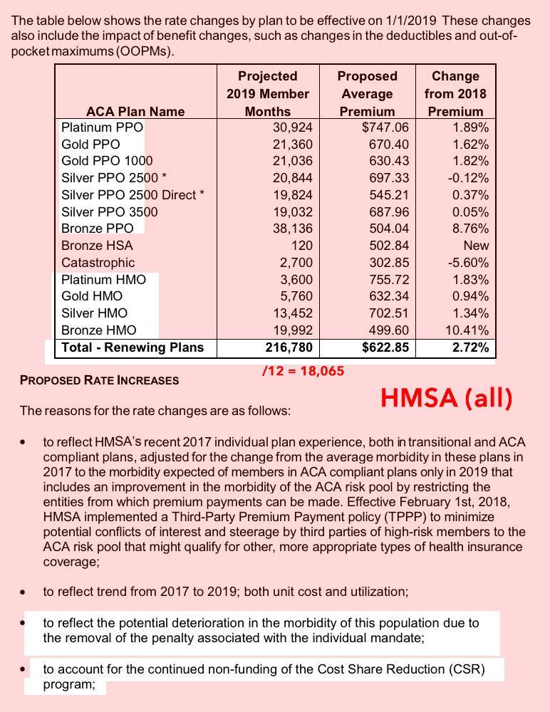 That leaves a 10-point ACA sabotage factor, which suggests that the 13.8% statewide premium increase would likely be closer to 3.8% if not for the mandate being repealed. The average unsubsidized premium in Hawaii is $625/month this year, so that means roughly $63/month or a $750 total sabotage tax for unsubsidized enrollees in 2019.