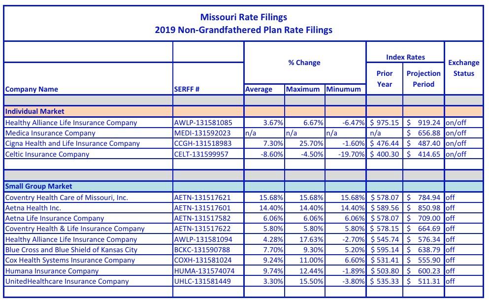 The Missouri Insurance Dept. has released preliminary 2019 rate filings for the individual and small group markets. Interestingly, in addition to the ACA compliant rate changes, they also posted transitional policy rate changes as well, which is unusual.