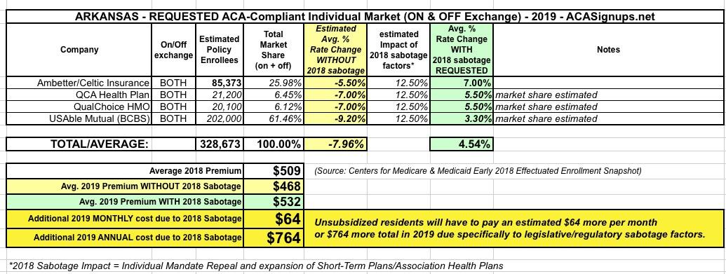Arkansas: Preliminary 2019 #ACA rate hikes: 4.5% INCREASE, but would have DROPPED by up to 8% w/out #ACASabotage