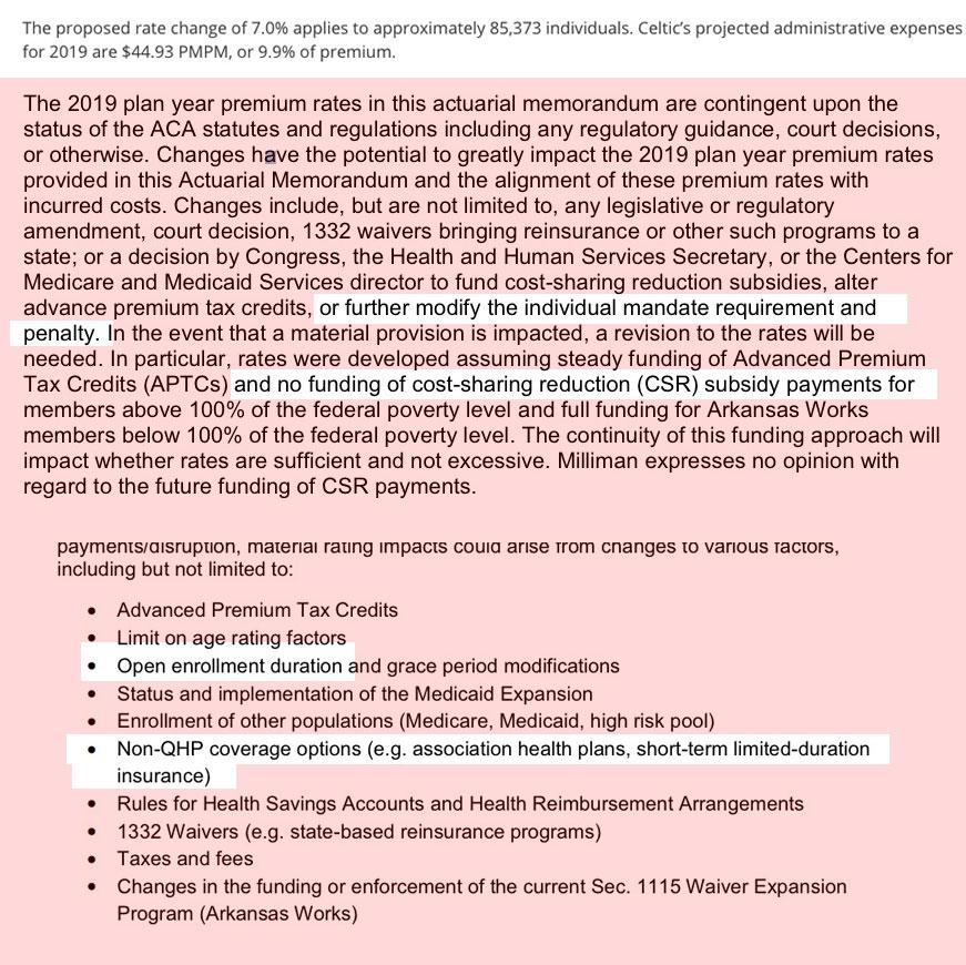 In terms of #MandateRepeal & #ShortAssPlans, the Urban Institute projected an 18.8 percentage point impact. 2/3 of that is 12.5%, so I'm estimating that without those factors, average unsubsidized Arkansas rates would be dropping by around 8% next year.