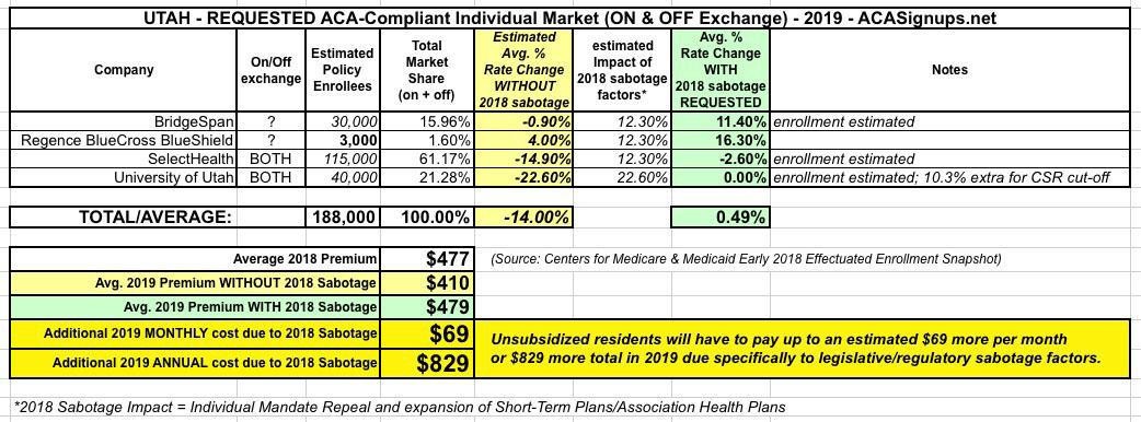 Utah: Preliminary 2019 #ACA rates change: FLAT, but would likely have DROPPED up to ~14% without #ACASabotage