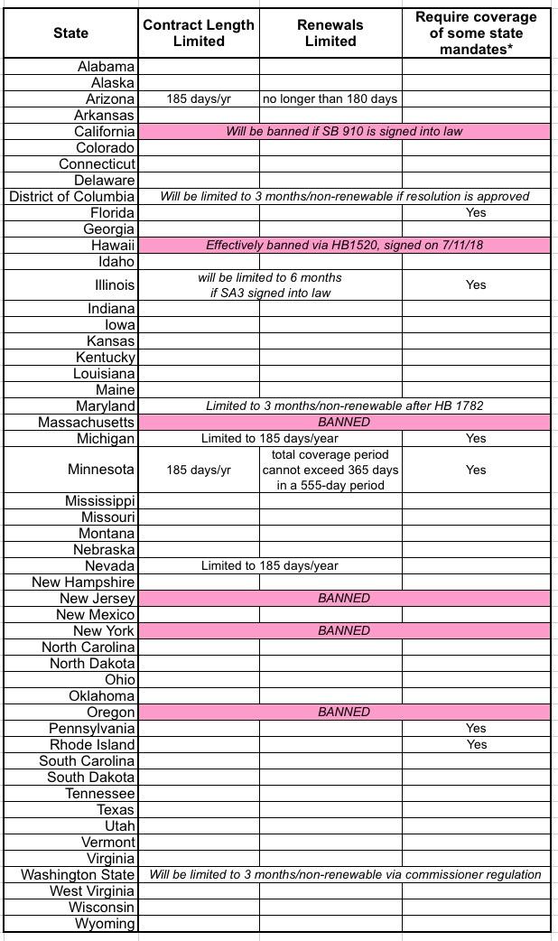 ...California currently only allows short-term plans to last for 185 days, with an option to renew for another 185 days only. The Democratic-dominated state legislature is poised to pass a bill that would ban the sale of short-term insurance plans outright.