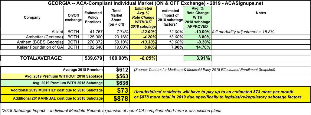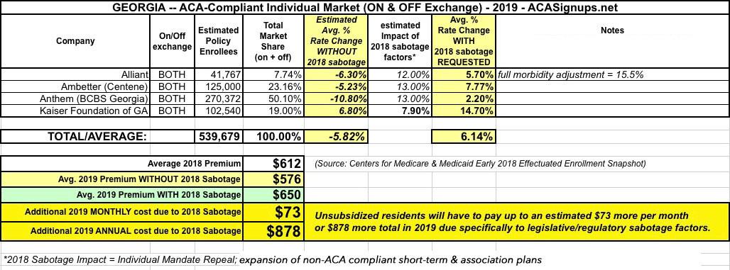 Georgia: APPROVED 2019 #ACA rate hikes: 3.9%...would likely have DROPPED ~8% without #ACASabotage