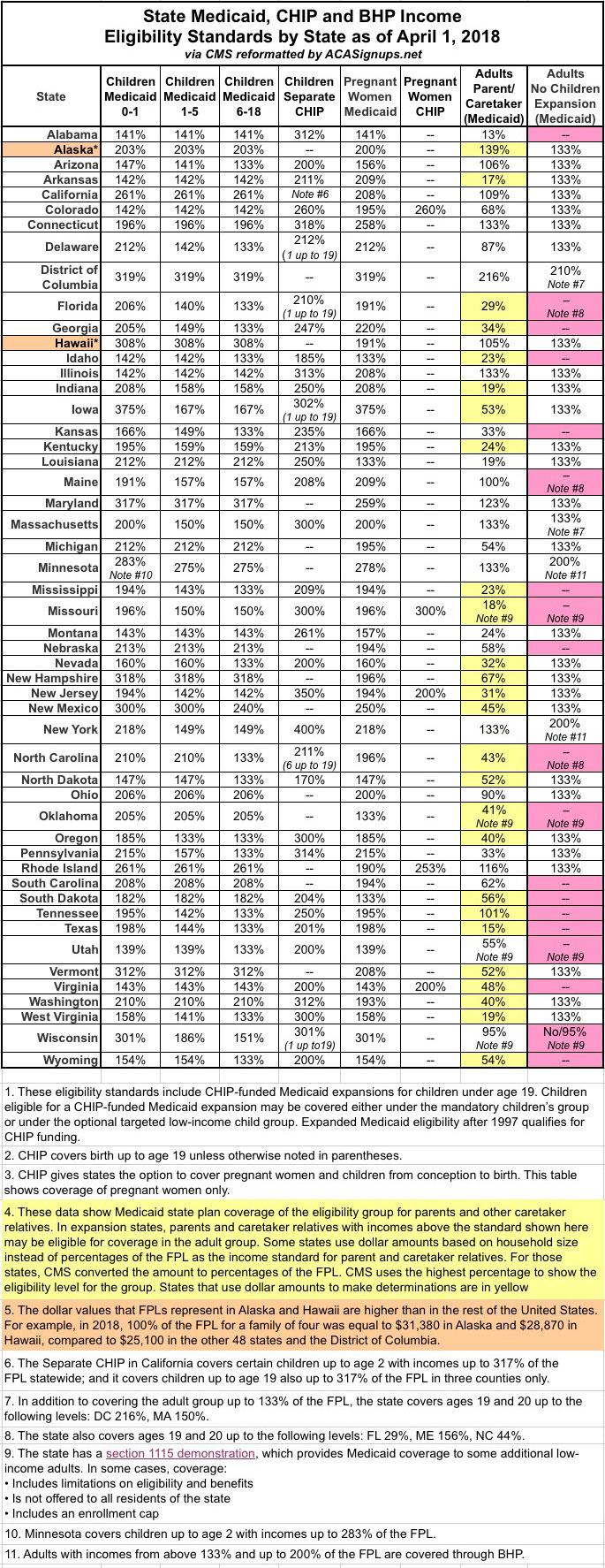 The following table provides eligibility levels in each state for key coverage groups that use Modified Adjusted Gross Income (MAGI), as of April 1, 2018. The data represent the principal, but not all, MAGI coverage groups in Medicaid, the Children’s Health Insurance Program (CHIP), and the Basic Health Program (BHP). All income standards are expressed as a percentage of the federal poverty level (FPL). The MAGI-based rules generally include adjusting an individual’s income by an amount equivalent to a 5% FPL disregard. Other eligibility criteria also apply, such as citizenship, immigration status, and state residency.