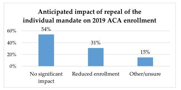 - Limited near-term impact from repeal of individual mandate: 54 percent of insurers surveyed do not expect the repeal of the individual mandate to have a significant impact on enrollment for 2019 ACA plans; 73 percent said that the repeal did not significantly impact their strategy for next year.