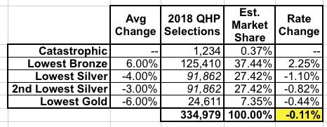 The full rate analysis report from the IL DOI isn't much better, I'm afraid; while it includes all sorts of geographic information (which carriers are offering which plans in which rating areas, etc), there's no hard numbers about individual carrier rates or enrollment numbers. Instead, the rate changes are broken out by metal level, as noted above: