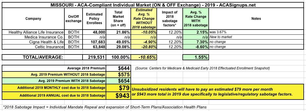 In Missouri, there's only four carriers offering policies on the individual market, and one of these (Medica) is new for 2019, so there's no year-over-year comparison to be made for them anyway. State regulators didn't make any changes to Cigna or Celtic/Ambetter, and only made a very minor tweak to Healthy Alliance, dropping their average rate increase from 3.67% to 2.15%. This means that instead of 1.9% overall, Missouri premiums are going up...1.6%. Not exactly earth-shattering, I know: