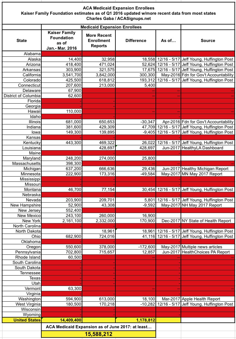 Add it all up and it's a net increase of 1.18 million people vs. KFF's total...for a grand total of nearly 15.6 million. Considering that many of these numbers are still up to 6 months out of date, my guess is that as of today, June 19th, 2017, the actual grand total is likely higher yet...and may even have cracked 16 million by now.