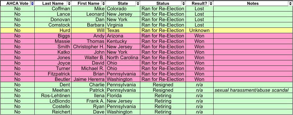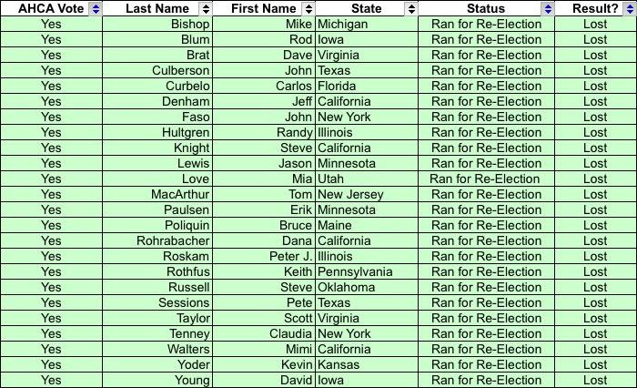 Out of curiosity, I went through the entire roll call vote and figured out exactly what the fate was of all 217 House Republicans who voted for the AHCA (It didn't need 218 votes to pass due to a handful of vacancies at the time).