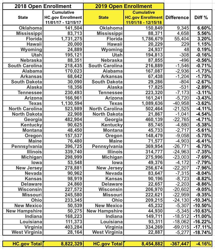 I should note that technically speaking, 2019 HC.gov enrollment is actually only 3.3% behind last year's final number, not 4.2%...because 79K was subtracted from last year's total but hasn't been subtracted from this year. The final/official tally should come out next Wednesday.