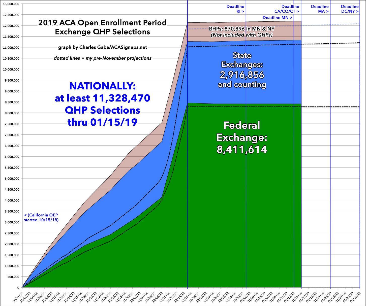 Vermont has been radio silent...I have no 2019 enrollment data from them whatsoever. Assuming they at least come close to last year, that should bump the national number by around 28,000 enrollees. I'm guessing another 60K - 70K will be added from the other incomplete state-based exchanges, for a grand total of just barely over the 3.0 million mark for SBEs...virtually identical to last year (again). If so, that would bring the grand total up to just a hair over 11.4 million QHP selections nationally.