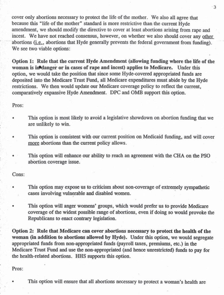 President Clinton ultimately approved "Option 1", which used a strict interpretation of Hyde for Medicare enrollees. As noted in the memo, this was less restrictive than the prior directive (life of the mother only) but more restrictive than how it had apparently been handled up until that point (life of the mother, health of the mother, rape, incest, deformed fetuses & mentally impaired mothers (the full memo clarifies that there were 700,000 seriously mentally impaired women of childbearing age on Medicare at the time...which means if they were pregnant, it would have to be due to their being raped).