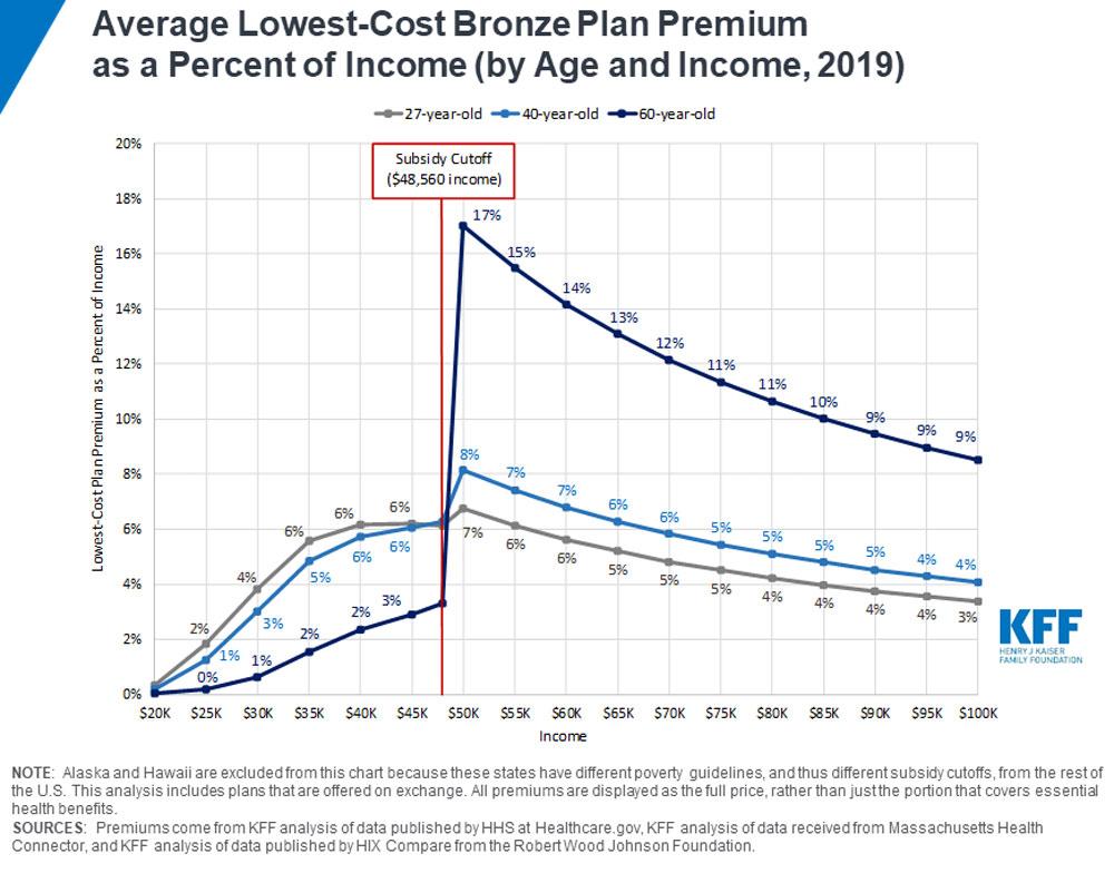 There you have it. The graph above shows three different scenarios: A single adult with no children at various income levelsranging from $20,000/year (around 165% FPL) up to $100,000/year (825% FPL), at three different ages. The sliding scale is reasonable for the 60-year old, and manageable for the 27- and 40-year old enrollees up until they hit the 400% FPL cut-off point...at which costs go up significantly for the 40-year old...and shoot into the stratosphere for the 60-year old. They go from paying around 3.5% or so of their income for a Bronze plan to a whopping 17% instantly. Note that this is for the cheapest Bronze plan, not the benchmark Silver plan.