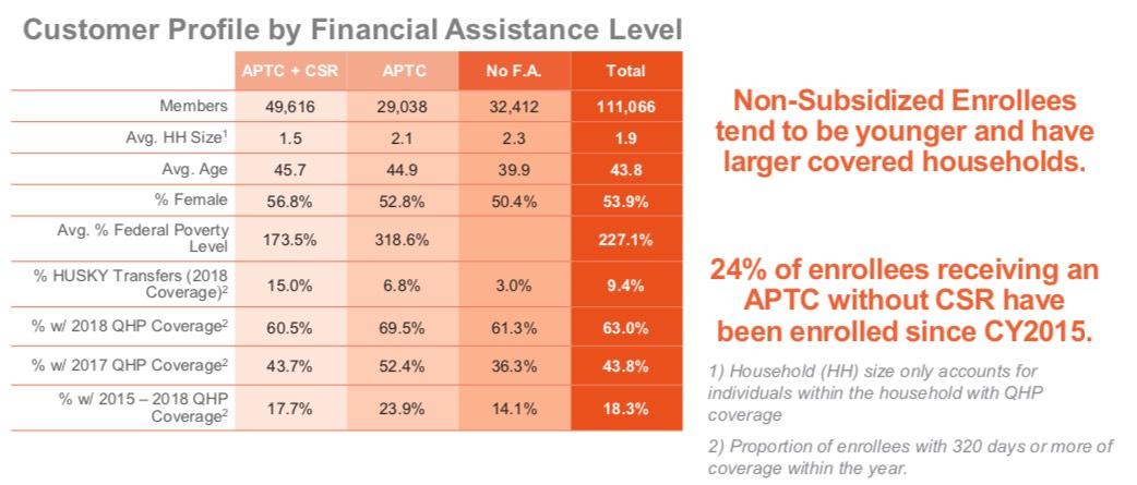 Access Health CT, Connecticut's state-based ACA exchange, released their 2019 Open Enrollment Period report, and it's one of the most extensively detailed & granual looks at the year's enrollment data. They've included the normal stuff, of course (subsidized vs. unsubsidized, metal levels, age and income brackets, etc)...but they've also done a very deep dive into data points I haven't seen before by cross-indexing categories.