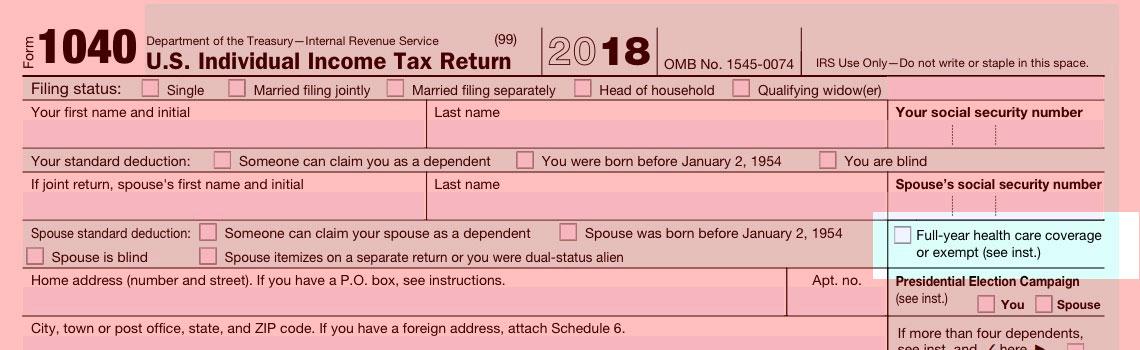 Checkbox on Form 1040. The “Full-year coverage” checkbox that was on line 61 of the 2017 Form 1040 has been moved to page 1 of the 2018 Form 1040 and retitled “Full-year health care coverage or exempt.” You will now check that box if you, your spouse (if filing jointly), and anyone you can or do claim as a dependent had qualifying health care coverage or a coverage exemption that covered all of 2018 or a combination of qualifying health care coverage and coverage exemptions for every month of 2018. If you can check the box on Form 1040, you don’t need to file Form 8965.