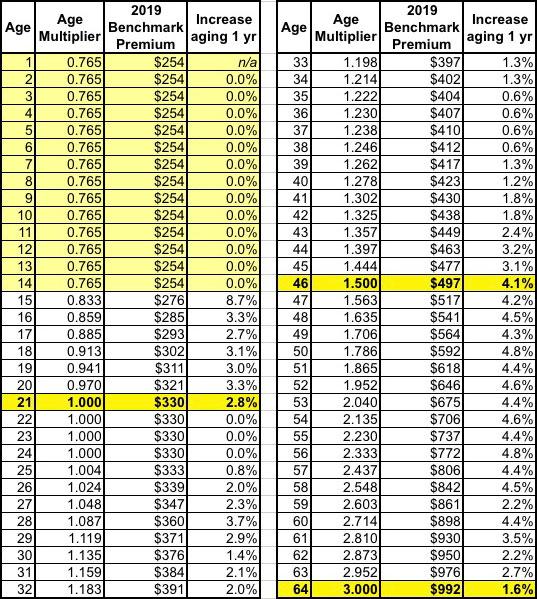 I've included examples of the national average benchmark Silver plan premiums according to HealthPocket.com. There are very slight variations in the dollar amounts (which are based on HealthPocket data), but overall the actual average rates are virtually identical to what they should be according to the formula. I also included a column showing how much a given enrollee's premium would increase year over year for the same policy as they age even if the official premium didn't change at all: