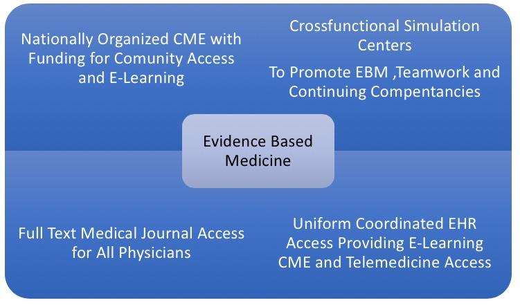 • CME programs must be organized at the national level. Using a web-based infrastructure learning process, CME should be offered, funded and readily available at the community level. These programs should be based on evidence-based guidelines with curriculum directed toward specialty integration and population needs. These programs can be tied to value-based reimbursement and incentivized with bonuses for continuing learning. Once our Medicare PPH system is up and running the EHR platform should be uniform across the country incorporating E-learning, CME, telemedicine and population and genomic health technology that is easily accessible and coordinated throughout the country.