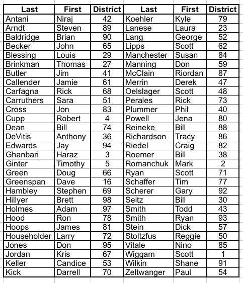 Antani Arndt Baldridge Becker Blessing Brinkman Butler Callender Carfagna Carruthers Cross Cupp Dean DeVitis Edwards Ghanbari Ginter Green Greenspan Hambley Hillyer Holmes, A. Hood Hoops Jones Jordan Keller Kick Koehler Lanese Lang Lipps Manchester Manning, D. McClain Merrin Oelslager Perales Plummer Powell Reineke Richardson Riedel Roemer Romanchuk Ryan Schaffer Scherer Seitz Smith, R. Smith, T. Stein Stoltzfus Vitale Wiggam Wilkin Zeltwanger Householder-58
