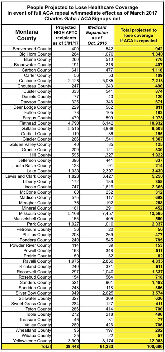 In Montana, assuming 59,000 people enroll in private exchange policies by the end of January, I estimate around 39,000 of them would be forced off of their private policy upon an immediate-effect full ACA repeal, plus another 61,000 enrolled in the ACA Medicaid expansion program, for a total of 101,000 Montana residents kicked to the curb.