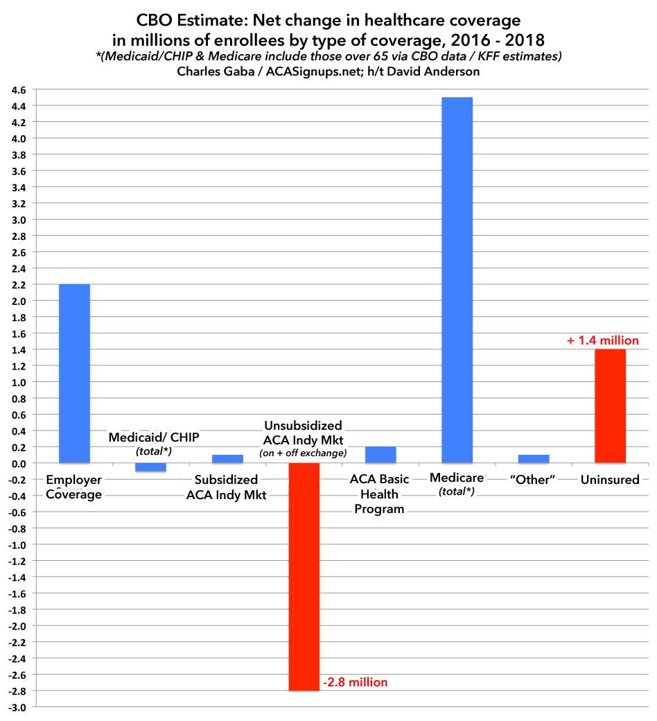 At first I assumed that most of those children being kicked out of the programs were being cancelled out by adults being added to Medicaid roles via ACA expansion, and that might be part of it...but then I realized that CFF's study is only looking at one year, while the CBO data covers two years.