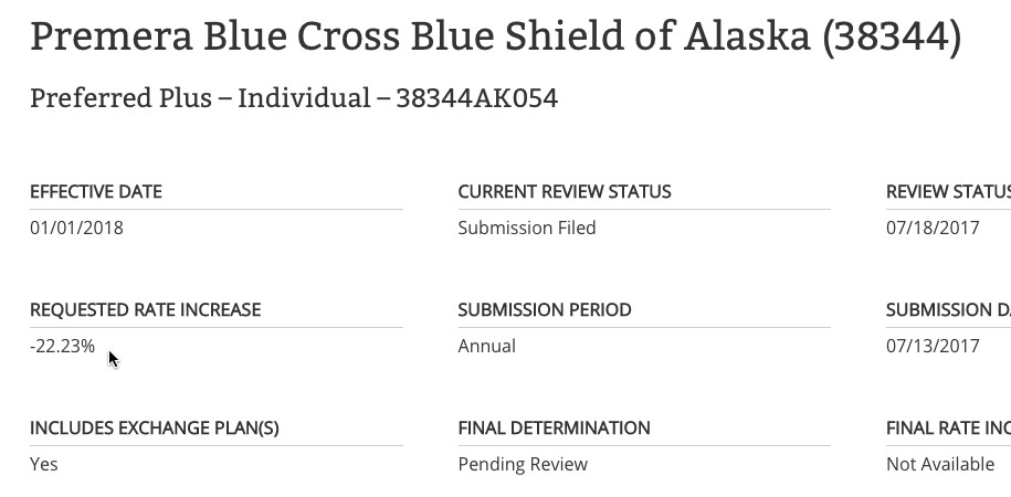 - ALASKA: BOOM: A whopping 22.2% rate drop over last year, thanks to their new reinsurance program. More impressivley, this article in Alaska Dispatch News confirms that the 22% drop assumes no CSR payments are made.