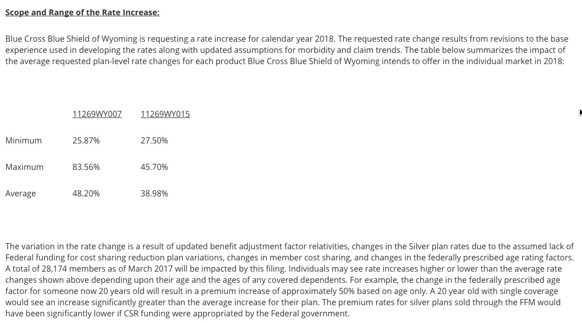- WYOMING: BCBSWY is the only carrier, but they submitted two separate filings, one for their on-exchange plans and the other for their off-exchange/dental plans. Again, they explicitly call out the CSR issue as a major factor. BCBS of Wyoming has 28,174 enrollees total, around 21,000 of whom should be enrolled in on-exchange plans, so the breakout should be something close to: