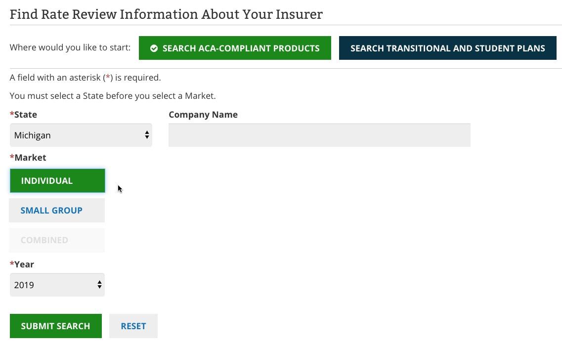 A few state insurance departments maintain their own rate review database which make it relatively easy to dig up the data I need, but most of them rely on the SERFF (System for Electronic Rates & Forms Filing) database, which can be a nightmare to navigate but includes the raw filings. The other website which I often rely on is the HealthCare.Gov Rate Review database, which only lists the essential filing form data, and does so in an easier-to-read format. The HCgov RR site breaks listings out between ACA-compliant and "transitional / student plans".
