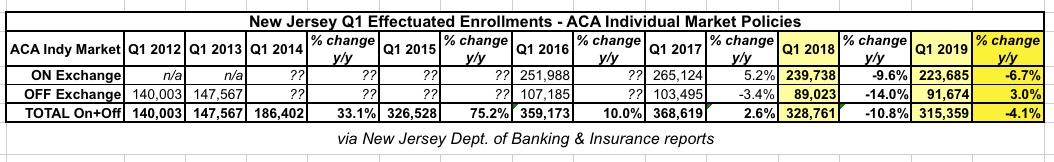 - First, this doesn't include off-exchange enrollment. In Q1 2018, they had around 89,000 effectuated off-exchange QHP enrollees. If the Q1 2019 off-exchange number also drops significantly, then the odds are that the reinstated mandate penalty went either unknown or unheeded. If it holds close to 89K, on the other hand, that suggests that a decent number of unsubsidized enrollees did enroll (grudgingly, perhaps) due to the mandate still being around. You'd really have to compare this with the off-exchange impact in other states as well, however.