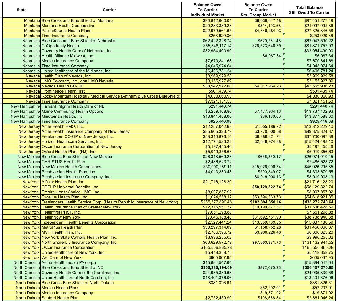 I noted earlier that a good twenty or so carriers have actually gone bankrupt...including Health Republic of NY. I assume their risk corridor payment would go to pay back the creditors. A few others have merged with or been acquired by other carriers; I have no idea how that will be handled.