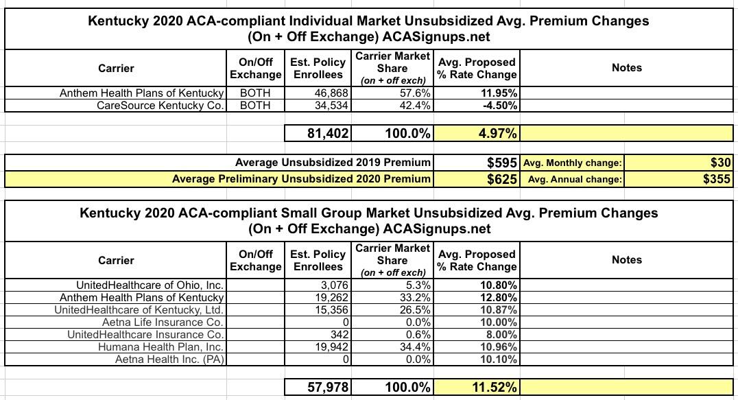Kentucky: PRELIMINARY 2020 ACA Exchange Premium Rate Changes: 5.0% increase