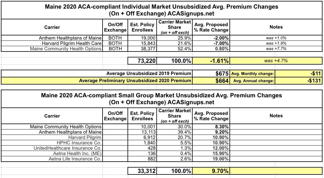 Maine: REVISED 2020 ACA Exchange Premium Rate Changes: 1.6% *decrease*